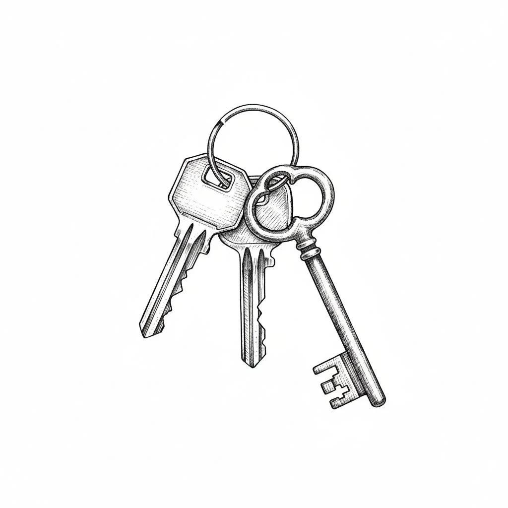 • A set of keys in pen-and-ink style