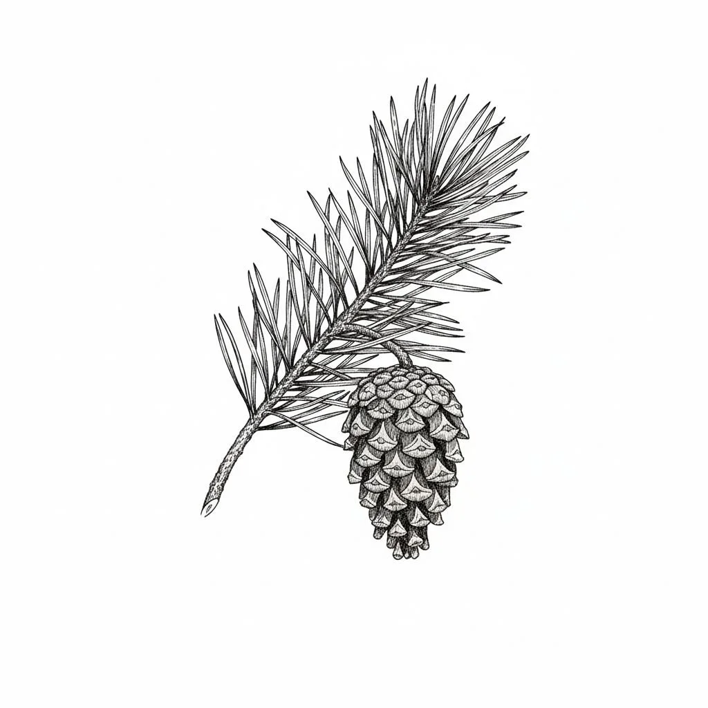 • A pine branch with pinecone in pen-and-ink style