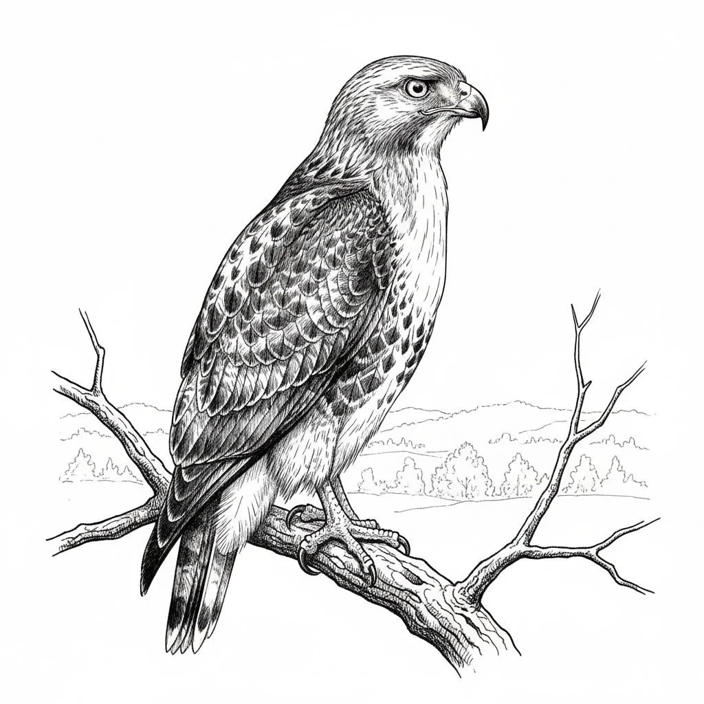 Black and white drawing of a hawk perched on a tree branch with a distant landscape of trees in the background.